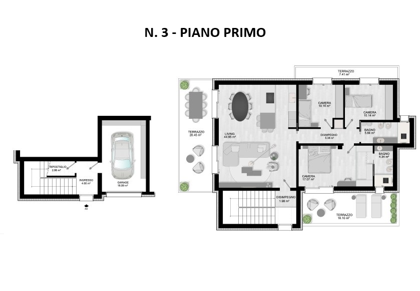 Due terrazzi di oltre 16 mq collegati a zona giorno e suite padronale.
